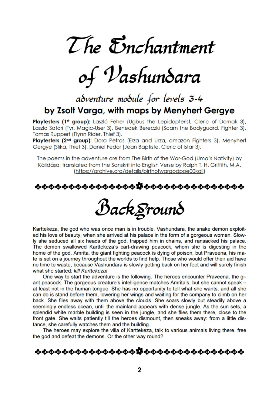 The Enchantment of Vashundara je 11stránkové dobrodružství pro postavy na 3. až 4. úrovni ve hře OSRIC (2006), potažmo jiných retroklonech D&D, vydané v pátém čísle zinu Echoes From Fomalhaut (2019). Inspiruje se starou indickou bájí a hráči se v něm na křídlech čarovného páva vypraví do paláce boha, jehož uvěznila hadí démonka. Můžou se ho pokusit zachránit… ale palác – v něm jsou hrdinové maličcí, protože je dimenzovaný na obry – a jeho visuté zahrady nabízejí i jiné možnosti. Jde o budovu pojatou jako menší dungeon o zhruba 20 popsaných lokacích.