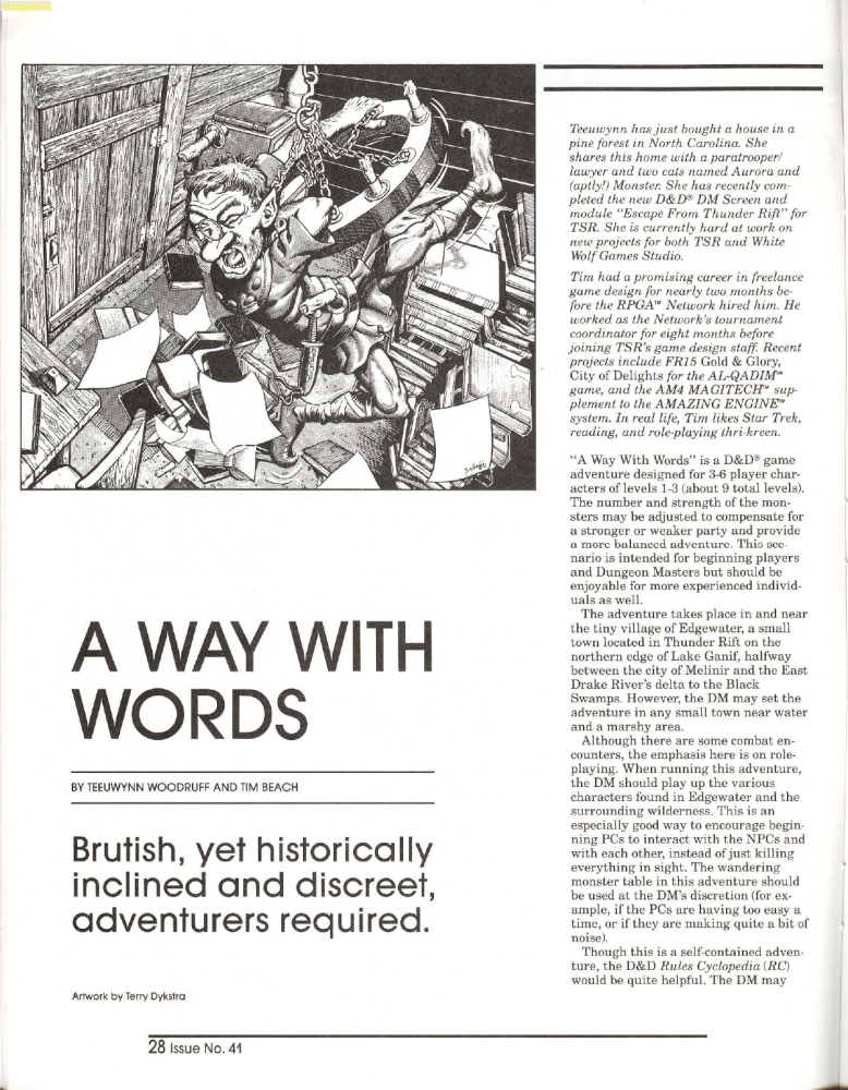 A Way With Words je 8stránkové humorně laděné dobrodružství určené postavám na 1. až 3. úrovni v Basic Dungeons & Dragons, původně vydané ve 41. čísle časopisu Dungeon (1993). Odehrává se v divočině, poblíž jezera Ganif v údolním minisvětě Thunder Rift. Gnómský archeolog Harfur, badatel zkoumající rozdíly mezi gnómskou a trpasličí poezií, požádá dobrodruhy, aby mu donesli důležitou knihu. Její držitelce, bardce Rhiannon, ji ovšem mezitím ukradla skupina koboldů, které dobrodruzi musejí pronásledovat do tábora, aby knihu po dobrém, nebo po zlém získali.