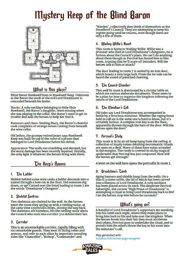 Mystery Keep of the Blind Baron je krátké dobrodružství pro Amazing Tales (2017) z prostředí Kouzelných království pro děti, které se nebojí prozkoumat děsivé starobylé kobky pod tajemnou tvrzí. Obsahuje mapu podzemí s několika místnostmi, které slouží jako jeskyně (dungeon).