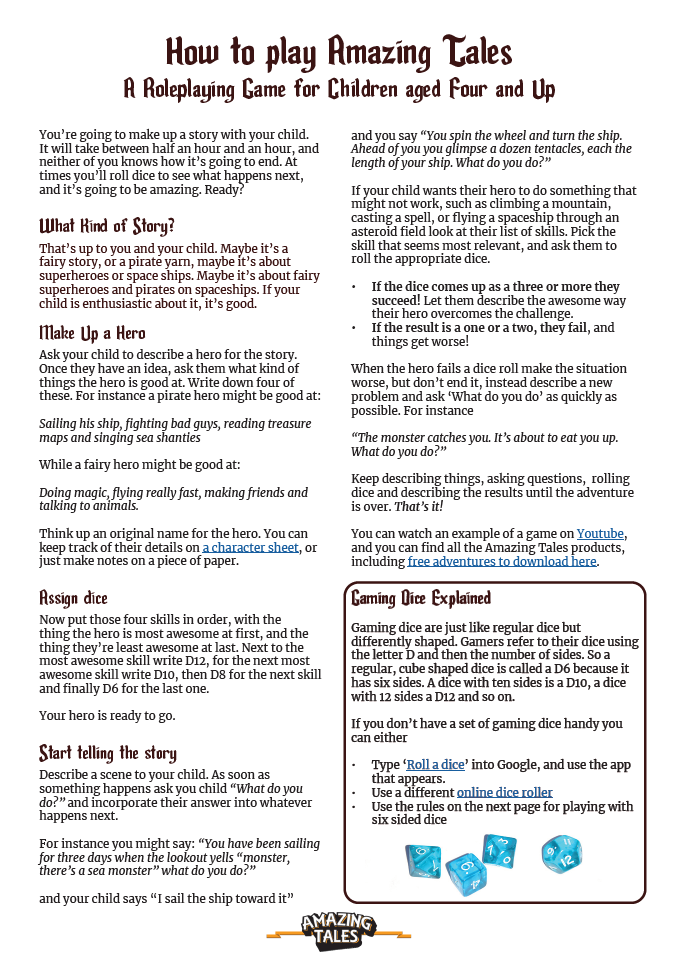 Amazing Tales Quickstart jsou stručná pravidla hry Amazing Tales (2017) na jedné stránce. Pravidla této hry jsou tak jednoduchá, že návod plně stačí na její naučení. Druhá strana obsahuje 10 tipů a triků a také alternativní pravidla ke hraní pouze se šestistěnnou kostkou.