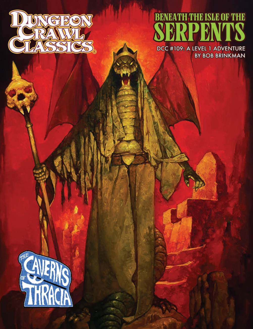 #109: Beneath the Isle of the Serpents je 20stránkové dobrodružství pro postavy na 1. úrovni v Dungeon Crawl Classics (2012). Rozvíjí motivy prezentované v rozsáhlém dobrodružství Caverns of Thracia (2025) a je zasazené do jeho širšího okolí, představeného v materiálech z řady DCC Caverns of Thracia. Postavy prošetřující záhadná zmizení se vypraví na odlehlý ostrov, kde se střetnou s pozůstatky civilizace hadích lidí. Modul začíná stručným průzkumem ostrova (3 popsané lokace a tabulka náhodných setkání) a vrcholí sestupem do podzemí z mnoha drobnými patry a východy (celkem 17 popsaných lokací).