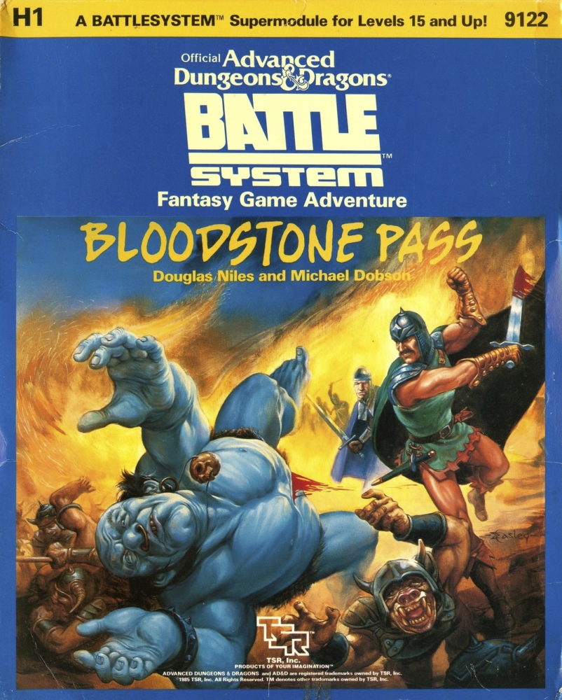 H1: Bloodstone Pass je dobrodružství pro první edici Advanced Dungeons & Dragons (1978) a zároveň scénář pro jeho pravidla bitev armád Battlesystem Fantasy Combat Supplement (1985). Je určené pro postavy na 15. a vyšší úrovni, a přestože obsahuje i pasáže věnované tradičnímu roleplayingu, většina scénáře se zabývá sérií rozsáhlých bitev armád. Hrdinové brání vesnici před útočící armádou, snaží se vycvičit a vyzbrojit zdejší rolníky, získat spojence a nakonec vyhrát válku. Zatímco začátek je relativně naskriptovaný, ve fázi plánování a budování armády se scénář otevírá do sandboxu.