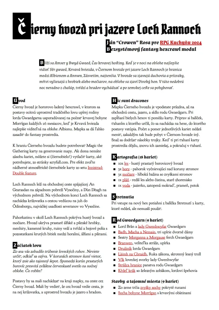 Čierny hvozd pri jazere Loch Rannoch je dvoustránkové bezsystémové dobrodružství vytvořené v rámci designérského jamu Dungeonová kuchyně 4 pořádaného RPG Fórem. Postavy se v něm octnou uprostřed tradičního lovu pořádaného upírskou rodinou a musejí především přežít. Dobrodružství je koncipované netradičním způsobem – představuje ho z velké části prázdná hexová mapa bez jakékoli pevně popsané lokace, jejíž obsah se vyplňuje průběžně taháním z balíčku předem připravených karet ze hry Magic: the Gathering. Jednotlivé karty slouží především jako vizuální a atmosférická inspirace, dobrodružství každou z nich shrnuje jednovětým popisem.