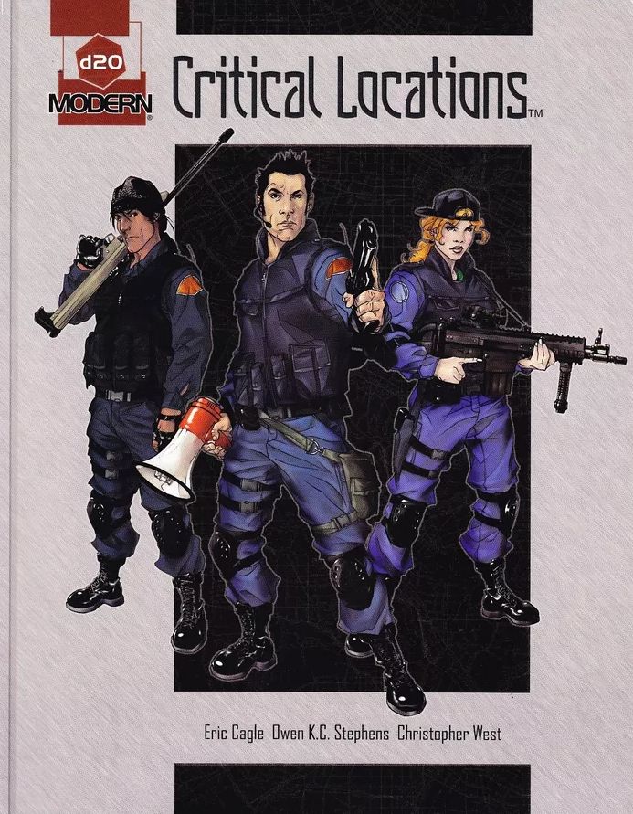 d20 Critical Locations je kolekce map, z nichž některé původně vyšly v časopise Polyhredon. Celkem 29 map a doprovodné texty představují lokace pro použití v d20 Modern (2002) nebo jiné hře zasazené do současnosti. Každá lokace obsahuje herní statistiky (např. odolnost dveří), typické předměty, které jsou na ní k nalezení a ukázkové statistiky nehráčských postav, které je tam možné potkat. Nechybí dva tři nápady na dobrodružství.