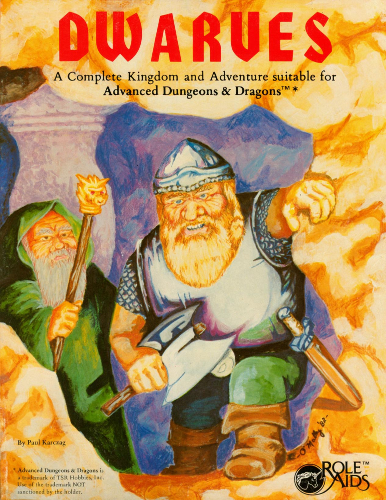 Dwarves je čtvrtý doplněk pro první edici Advanced Dungeons & Dragons (1978) ze série Role Aids a první z této série, který není jen dobrodružstvím. Zhruba polovinu 96stránkové knihy tvoří podrobné představení trpasličího království, jeho historie, společnosti, náboženství, tradic, trpasličí magie a artefaktů, včetně popisu města připomínajícího Morii a přilehlých osad. K dispozici jsou taky rozšířené možnosti pro tvorbu trpasličích postav. Jedná se o jeden z prvních doplňků pro AD&D, které se v takové míře detailu věnují konkrétní rase nebo povolání.