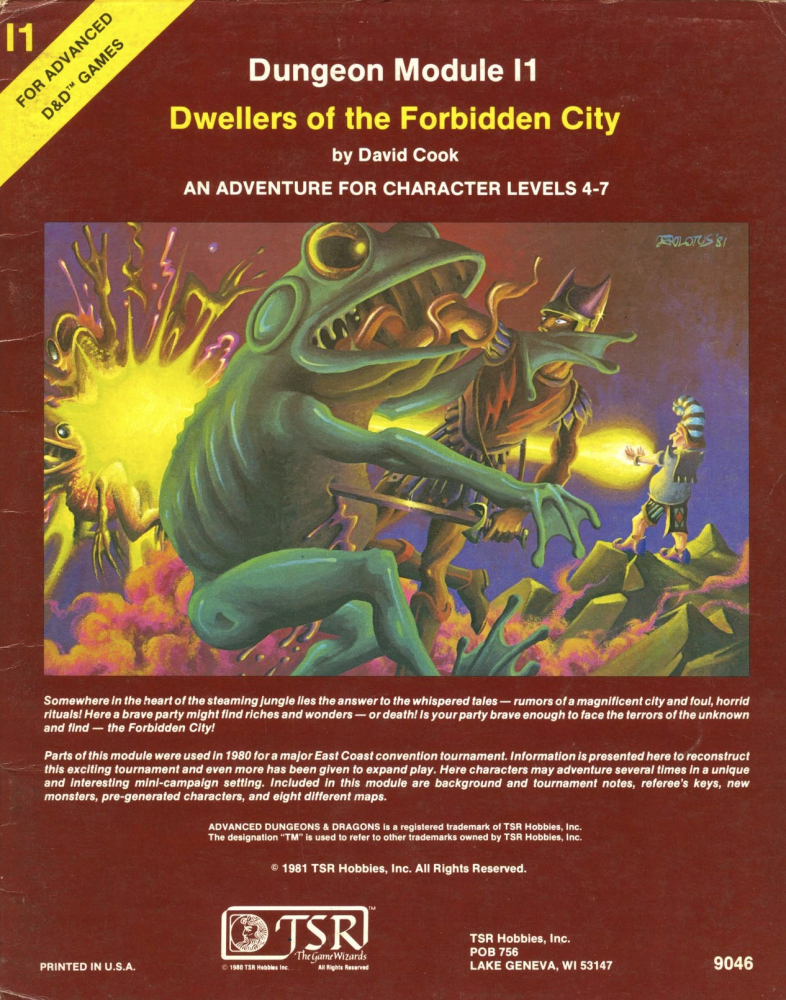 I1: Dwellers of the Forbidden City je 28stránkové dobrodružství postavy na 4. až 7. úrovní v Advanced Dungeons & Dragons (1978), první modul série I – Intermediate. Družina se v něm doslechne o banditech přepadávajících karavany v džungli. Stopa ji zavede do ztraceného města v pralese, tvořeném několika dobrodružnými místy a dvěma menšími dungeony.