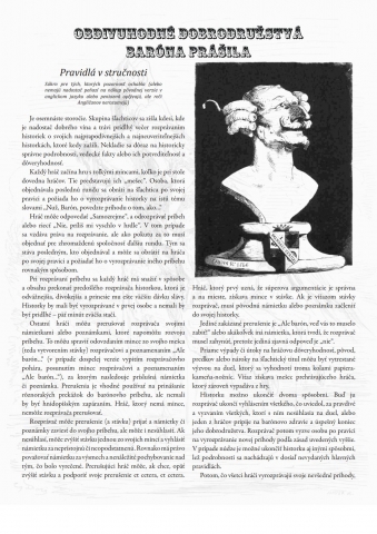 Barón Prášil je ďalší príspevok do čeľade rolových-nerolových hier. Štatistiky žiadne (ba! meno postavy), vyhodnocovanie konfliktov tiež nie. Cieľom každého hráča je ,,z fleku" vyrozprávať krátky (najviac päťminútový) bombastický príbeh. Pasívnejšie povahy však majú našťastie pomoc - ostatní hráči ich prerušujú, aby zavádzali dejové zvraty či inšpirovali rozprávača k posunu historky. Medzi tým kolujú žetóny, ktoré majú hlavne motivačný charakter a bránia prílišnému prerušovaniu. Hra samotná vyplní zábavu medzi druhým a tretím pivom, za dvadsať minút dáte jedno kolo a to stačí. Na rozdiel od Mexického patu však nepotrebujete ani tak obrovskú krátkodobú pamäť, ako skôr kreativitu na vytváranie absurdných historiek. To však nebýva problémom, pretože Barón Prášil exceluje tam, kde tkvie nevýhoda iných voľných hier. Kým zvyčajne je absurdnosť a fraška prejavom stratených hráčov, ktorí nevedia uchopiť zmysluplnú líniu, a vedú príbeh do rozdivočenej zábavy (kde vážni hráči škrípu zubami), v Prášilovi platí, že čím absurdnejšia historka, tým väčšia zábava. Pamätáte si na gilliamovské animované vsuvky v Lietajúcom cirkuse? Presne túto atmosféru podporuje už aj samotný štýl textu i záplava nápadov na historky. (Spomínal som Pythonovcov? ,,Povedzte nám, barón, ako ste zoťali najmocnejší strom v lese pomocou haringa" je jednou z ukážok.) Barón Prášil je jednoducho krátka zdivočelá zábava, ktorú sa oplatí skúsiť.