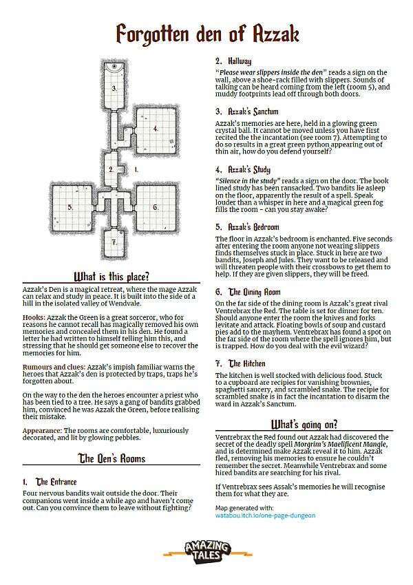 The Forgotten Den of Azzak je krátké dobrodružství pro hru Amazing Tales (2017) zasazené do prostředí Kouzelných království pro děti, které chtějí pomoci zapomnětlivému čaroději vyřešit záhadu jeho vzpomínek. Obsahuje mapu čarodějova doupěte s několika místnostmi a pastmi a nepřátelskou frakci.