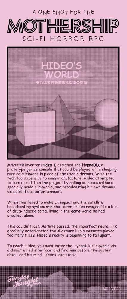 Hideo's World je druhý oficiální brožurový scénář pro sci-fi hru Mothership. Jistý geniální vědec byl uvězněn ve svojí vlastní zvrhlé virtuální realitě, která se postupně rozpadává. Postavy se ho do virtuálního světa vydávají zachránit dřív, než ho stihne permadeath. Jednorázové dobrodružství má strukturu jednoduché sítě osmi lokací v pomatené virtuální realitě, zabydlených unikátními tvory a reklamami.