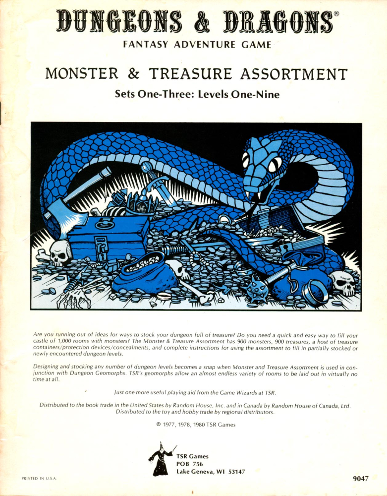 Monster & Treasure Assortment Sets 1–3: Levels One–Nine je 32stránkový sborník náhodných tabulek primárně pro původní Dungeons & Dragons (1974), případně i pro Holmesovo (1977) a Moldvayovo Basic Dungeons & Dragons (1981). Obsahuje celkem 900 setkání s nestvůrami a 900 pokladů, po 100 pro každé patro podzemí.
