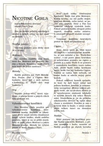 Jakákoliv slova k Nicotine Girls vás jen zbytečně oddalují od samotného přečtení této hry - má to jen dvě stránky, takže klikněte na "Překlad" kousek výše a udělejte si vlastní názor. Můj zní takto: dobrý námět a dají se v tom odehrát velmi zábavné hry (několikrát vyzkoušeno). Nikdy jsem nečekal že hra na "děvčata, které se marně pokoušejí uskutečnit své sny," mě bude bavit... ale bavila. Takže autor očividně někde něco udělal dobře. Bohužel je to jen takový nástin možného, budete muset zapojit vlastní fantasii a doplnit si bílá místa. Nicotine Girls jsou skvělá myšlenka, dobrý nástin pravidel, ale není to dokončená hra.
