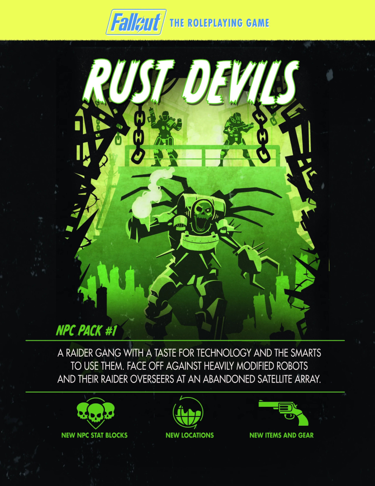 NPC Pack #1: The Rust Devils je drobný, 38stránkový PDF doplněk k Fallout: The Roleplaying Game (2021). Představuje skupinu nájezdníků Rust Devils, známou z rozšíření Automatron pro videohru Fallout 4. Jde o gang nadšenců do technologií, kteří využívají silně modifikované roboty a nosí zbroje vyrobené z robotických součástek. Dokument obsahuje charakteristiky a herní statistiky hlavních postav a robotů, detailní informace o historii a motivech frakce a šest námětů na zápletky.
