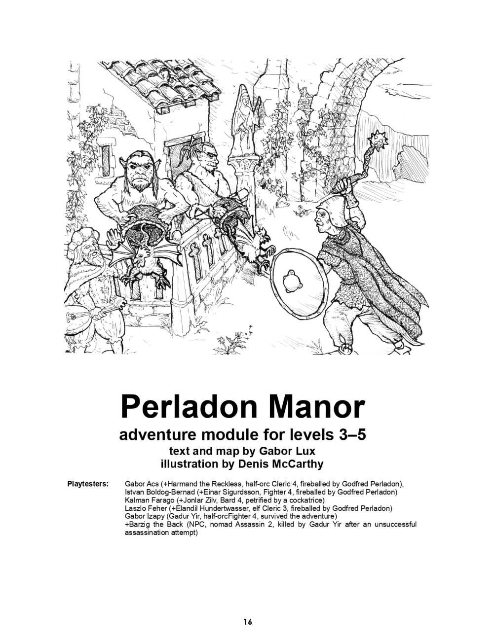 Perladon Manor je krátké, 6stránkové dobrodružství určené postavám na 3. až 5. úrovni ve hře OSRIC (2006) nebo jiných retroklonech. Popisuje zříceninu vily se sklepením (8 + 7 očíslovaných lokací), kterou obývá skupinka zlobrů se svými zajatci a také původní majitelé domu, toho času nemrtví. Dobrodružství se odehrává na ostrově Erillion, na pobřeží nedaleko od města Gont, známého z druhého čísla zinu Echoes from Fomalhaut (2018).