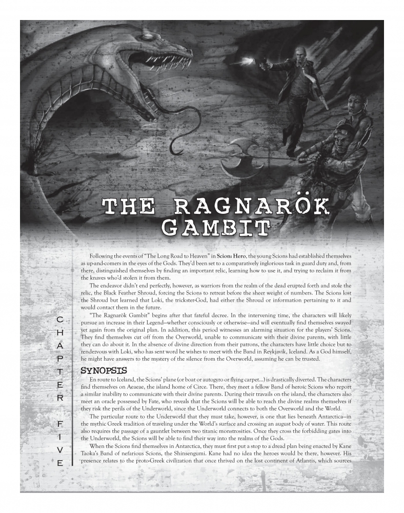 The Ragnarök Gambit je druhé ze tří dobrodružství, které demonstrují jednotlivé stupně moci postav (Hero, Demigod, God) a zároveň tvoří společný příběh volně rozesetý do delší kampaně. Navazuje na The Long Road to Heaven (2007) ze Scion: Hero (2007) a předchází Titanomachy (2008) ze Scion: God (2008).