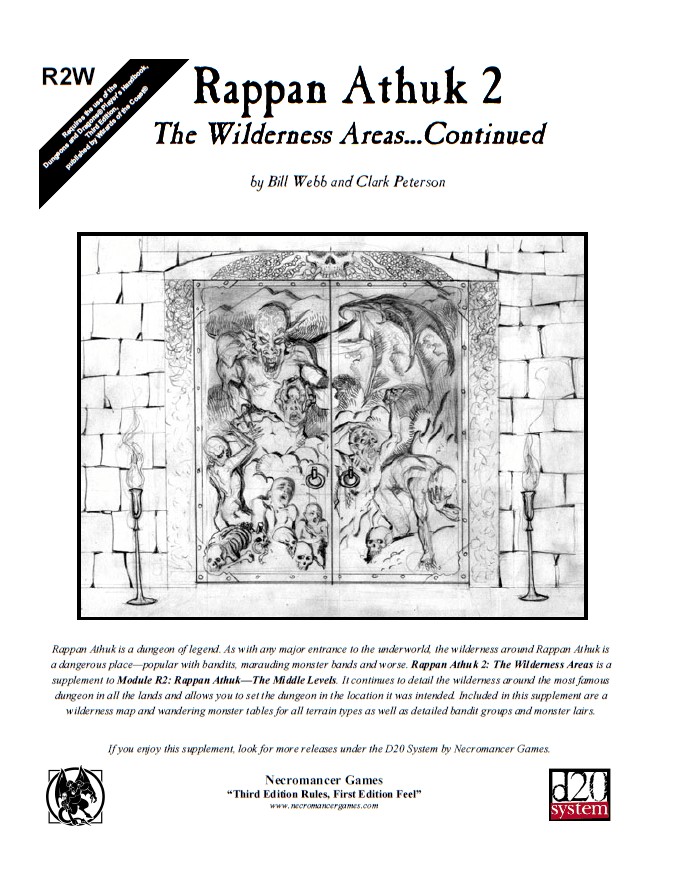 Rappan Athuk 2: The Wilderness Areas…Continued je drobný, 14stránkový elektronický doplněk pro megadungeon Rappan Athuk v jeho verzi pro třetí edici D&D. Přidává další lokace v krajině okolo samotného megadungeonu, včetně mapy divočiny, tabulky náhodných setkání v různých typech terénu a podrobného popisu různých loupežnických tlup a doupat nestvůr.