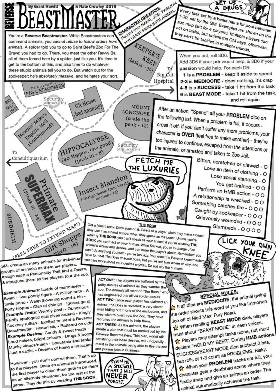 Reverse Beastmaster je jednostránkové komediální mini-RPG o „reverzních pánech šelem“ – lidech, kteří zvířatům nerozkazují, ale naopak musejí vyslechnout každý příkaz, který jim jakékoli zvíře dá. Hra se odehrává v zoologické zahradě, kam postavy poslal pavouk a kde je čeká celý den plnění ponižujících příkazů pro zvířecí pány a nakonec (zřejmě) uskutečnění velkého zvířecího úniku.