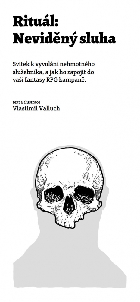 Rituál: Neviděný sluha je stručná skládací brožura o formátu A4, která představuje jednoduchý návrh, jak do libovolné fantasy hry vložit svitek, který popisuje rituál k vyvolání neviditelného služebníka. Obsahuje náhodné tabulky toho, co služebník chce nebo jak je poután.