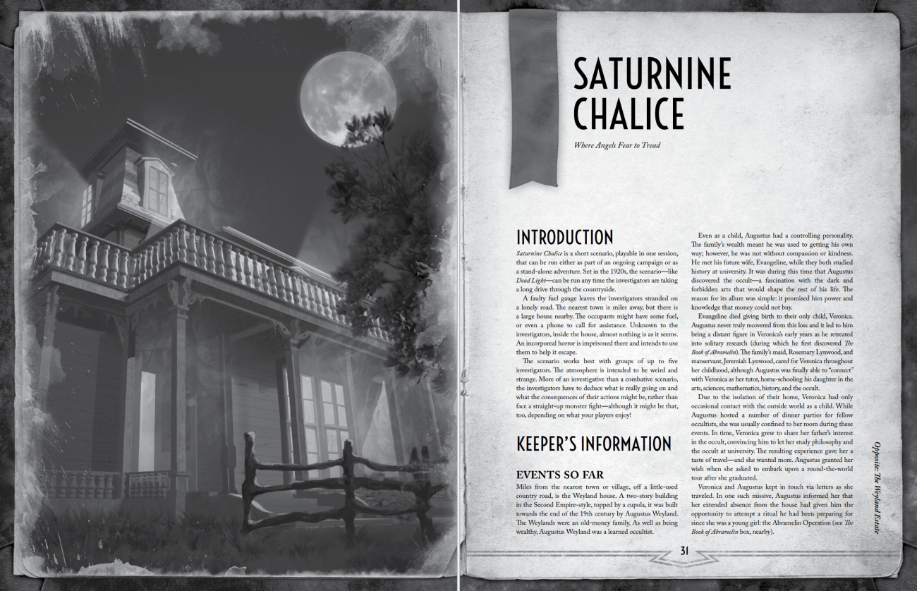 Saturnine Chalice je krátké dobrodružství pro sedmou edici Call of Cthulhu (2014) určené pro jednotlivé sezení nebo jako výplňovka během cestování v rámci delší kampaně. Kromě samotného řešení záhady nabízí hra i jednoduché puzzly k řešení hráčům, kteří o to mají zájem, a odkazy a narážky na problematiku andělů a abrahámovských náboženství pro ty, kteří tomu rozumí.