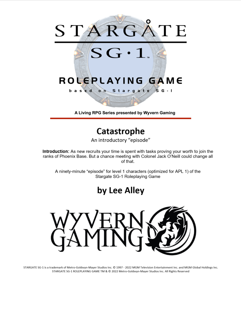 Side Mission Intro – Catastrophe (v českém překladu Úvodní epizoda – Katastrofa) je bezplatný úvodní scénář pro Stargate SG-1 Roleplaying Game (2021) ve formě bezplatného PDF. Zabere zhruba 90 minut herního času. Hráči jako noví rekruti na základně prokazují, že jsou plnohodnotnými členy týmu, když se všechno změní nečekaným setkáním s Jackem O'Neillem.