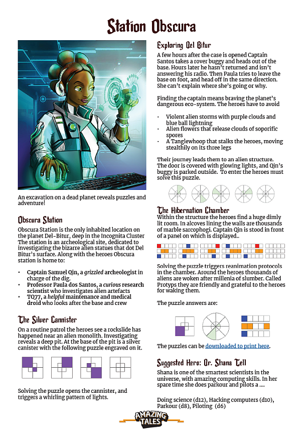 Station Obscura je krátké dobrodružství pro hru Amazing Tales (2017) v prostředí Mezi hvězdami pro děti, které se nebojí prozkoumat cizí planetu a při tom vyřešit několik hádanek. Obsahuje zápletku, tři hádanky s řešením a navrhovanou postavu.