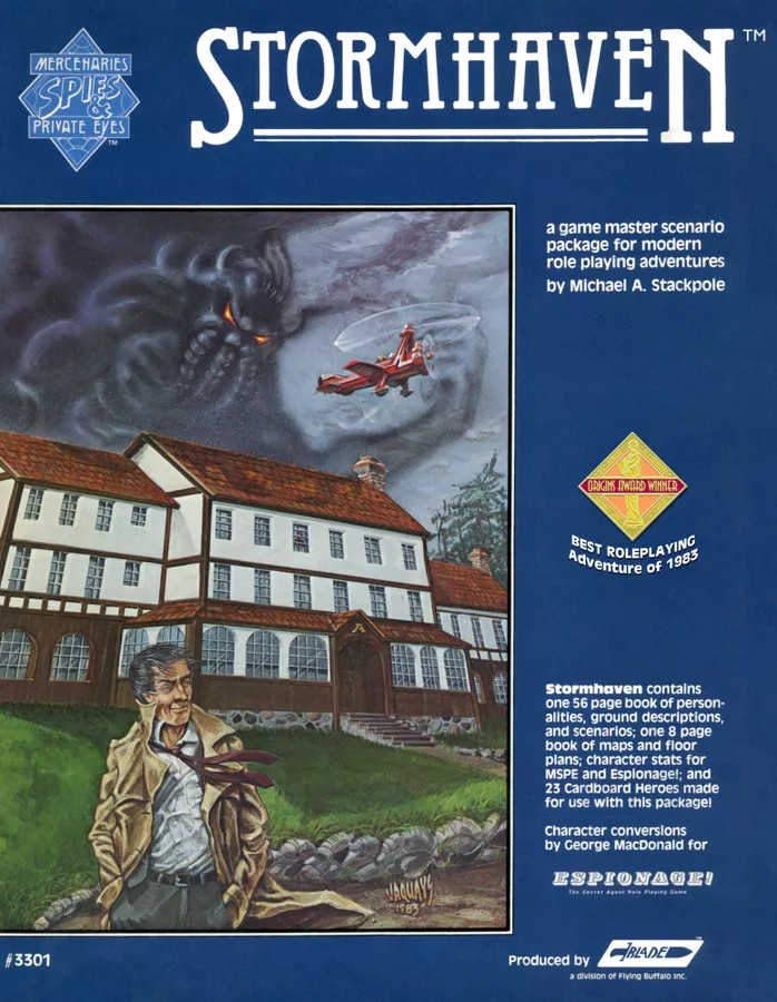 Stormhaven je dobrodružství, které v rámci spolupráce mezi vydavateli vyšlo opatřené dvojími statistikami, jak pro hru Mercenaries, Spies & Private Eyes (1983), tak pro Espionage! (1983), silně inspirované žánrem pulpové fikce. Titulní Stormhaven je dobře střežené sídlo ředitele technologické korporace, nacházející se na ostrově uprostřed jezera, kam si majitel zde důležité vědce, politiky i excentriky. V laboratořích pod sídlem probíhají tajné výzkumy…