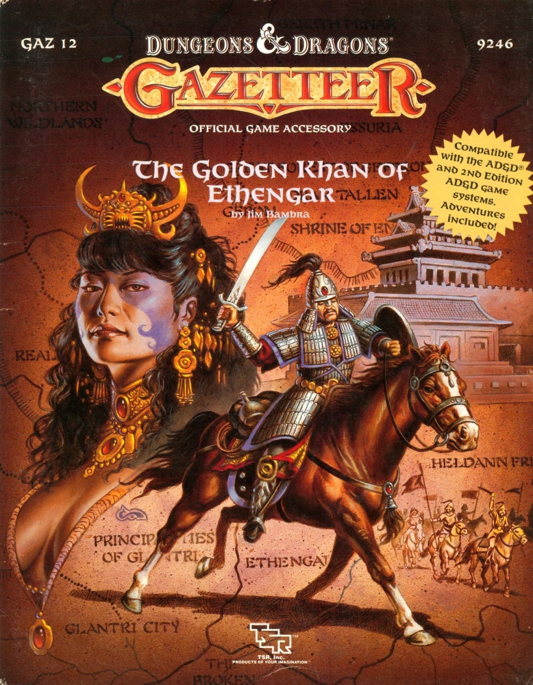 GAZ12: The Golden Khan of Ethengar je dvanáctou příručkou v řadě D&D Gazetteers, tedy Věstníků o „Známém světě“ Mystara. Popisuje nekonečné travnaté pláně obývané národy obávaných válečníků, kteří se rodí, žijí a umírají v sedle. Příručka je rozdělená na sešit pro hráče a sešit pro vypravěče.