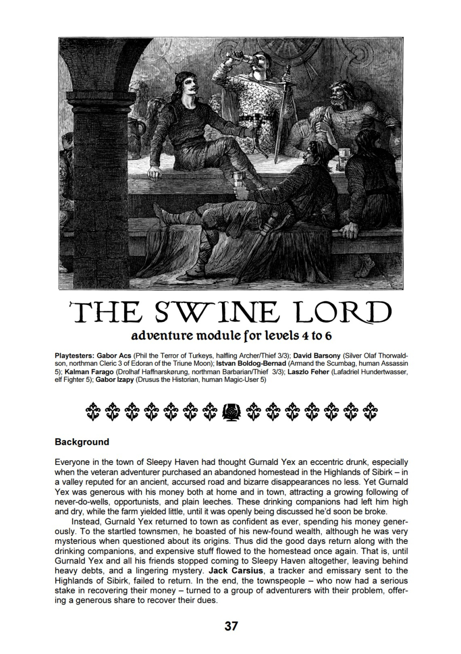 The Swine Lord je pointcrawl v čarovném lese asi sto mil od Gontu s trochou bojů, vyjednávání a hádanek. Gábor si drží vysoký standard, přesto vidím drobnou potíž lesa v tom, že v něm není moc co dělat. Respektive funguje jako dobrodružné místo umístěné na mapě světa, žijící si vlastním životem a pro kampaň možná významné, možná ne, nečekejte ale sevřené dobrodružství, které poskytne uspokojivý zážitek samo o sobě. Dobrodruhy do něj přivede nejspíš vymáhání dluhů, které se záhy změní v problém s orky a jejich vězni, případně čarovná cesta s hádankami v průběhu a portálem na konci. Řešení obojího je na můj vkus příliš nevariabilní a zároveň obtížně dostupné. A určitě doporučuji připravit si dopředu pro les vlastí, specifická náhodná setkání. Autor doporučuje použít defaultní setkání z AD&D (konkrétně sylvan wood), mně se ale osvědčilo dopředu si jich cca 10 vytvořit a tím les ještě víc provázat a zaplnit. Dobrodružství je dějově propojeno s kratičkým All is Well in Sleepy Haven z Echoes #05, pomůže pročíst i to.