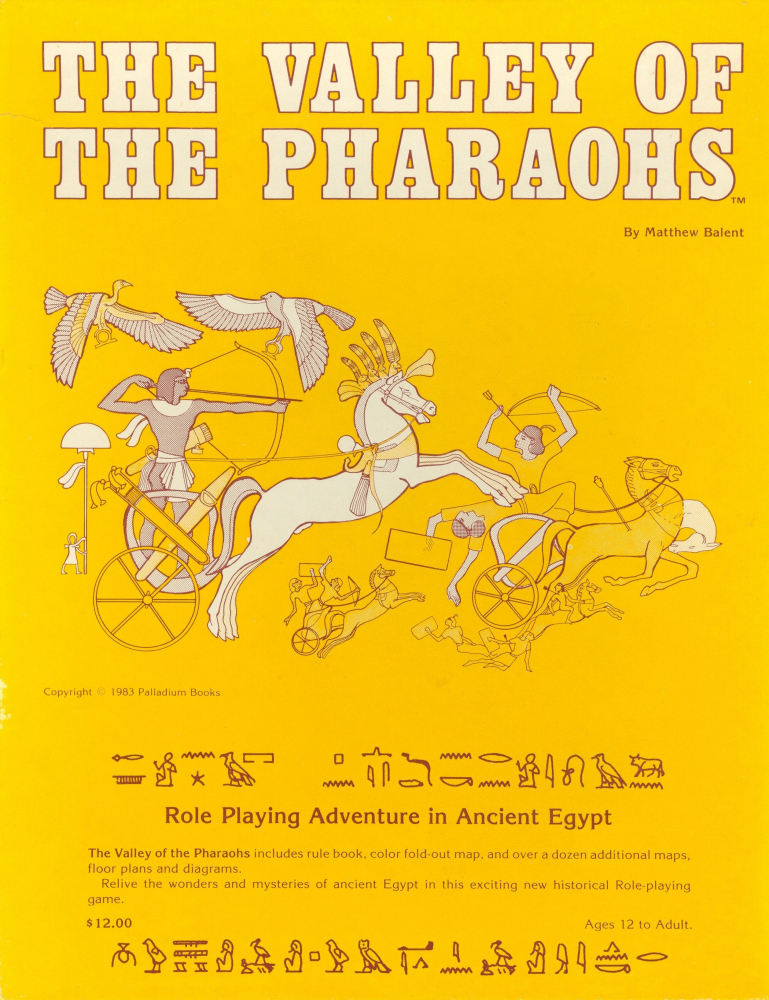 The Valley of the Pharaohs je první RPG hra zasazená do starověkého Egypta, konkrétně do období Nové říše kolem roku 1450 př. n. l. Vyznačuje se relativně stručným, přímočarým systémem a solidní oporou v dobře vybádaných historických materiálech. Hra příliš nespecifikuje, jakým aktivitám se postavy můžou věnovat. Od běžného dobrodruhování spíš zrazuje (nelíbilo by se státní moci), a tak doporučuje spíš zakázky pro šlechtu, chrámy, diplomatické mise a jiné, historicky uvěřitelné aktivity.