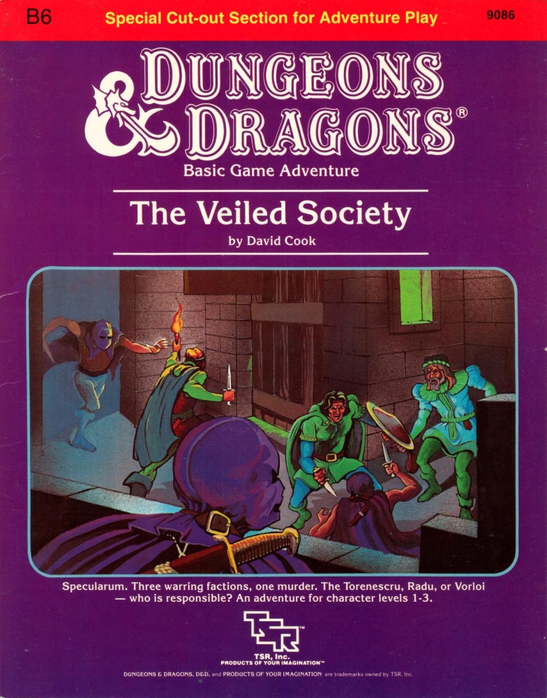 B6: The Veiled Society je netradiční, 16stránkové dobrodružství pro postavy na 1. až 3. úrovni v Basic Dungeons & Dragon. Je první ze začátečnické série B – Basic, které není dungeon. Odehrává se ve Specularu, hlavním městě knížectví Karameikos ve světě Mystara. Zároveň není „založené na lokacích“ a místo toho se soustředí na události odehrávající se ve městě – například na pouliční bouře nebo festival.