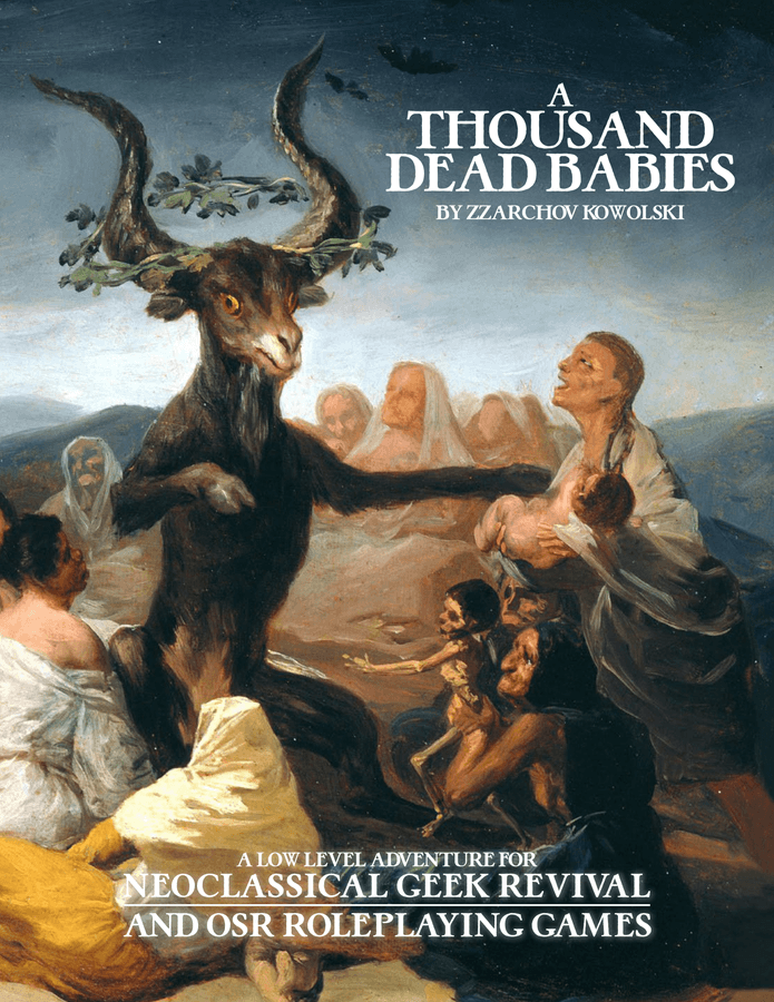 A Thousand Dead Babies je jednoduché dobrodružství pro začínající postavy o pohanech, čarodějnicích a Církvi svaté. Předpokládá fantasy variantu středověké nebo raně novověké Evropy, případně podobné prostředí. Popisuje spletitou situaci v obci, kde je možné přidat se k jedné z několika stran doutnajícího sporu. Kromě sociální části obsahuje pár dobrodružných lokací po okolních lesích a jeden minidungeon. Má lehké prvky body hororu a potenciálně znepokojivé motivy.