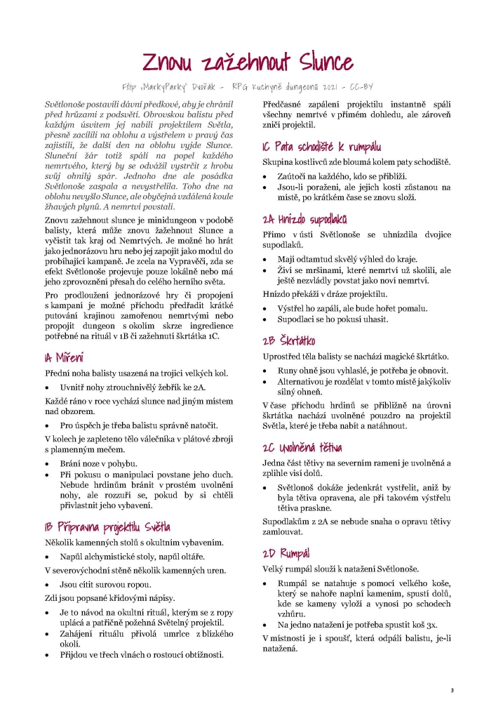 Znovu zažehnout Slunce je stručné, dvoustránkové dobrodružství bez určení pro konkrétní hru, které vzniklo v rámci tvůrčí výzvy RPG Fóra Dungeonová kuchyně 21. Jde o fantasy dungeon v podobě obří balisty, která má zachránit svět před nemrtvými – je ale v trochu horším stavu, a jestli hráči chtějí nemrtvé porazit, budou se muset ohánět.