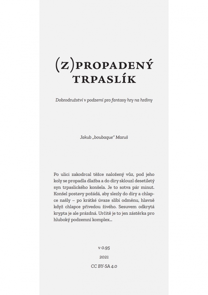 (Z)propadný trpaslík je dungeon v lehce oldschoolovém stylu, využitelný v jakékoli dobrodružné fantasy hře. Hráči se v něm vypraví do nově objeveného podzemí městského domu, kde zmizel chlapec a je potřeba ho najít. Dobrodružství je určené pro postavy na první, případně jiné nízké úrovni a postavené převážně na průzkumu; příležitostí k vyjednávání je málo. Vystačí asi na 4 až 6 hodin hraní – zvýšená zvědavost a opatrnost hráčů může hru ještě o něco protáhnout.