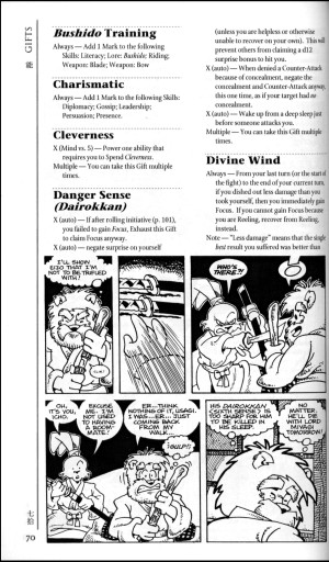 Velmi důležitou roli ovšem hrají „talenty“ (gifts – nadání, zvláštní schopnosti), kterých má na počátku hry každá postava deset. Podle výběru rasy (mezi nimiž se objevují zvířata, nejen běžná v Japonsku; ale také máte možnost vybrat si „neurčitou“ nebo se svolením vypravěče speciální rasu, jako je krtek, had či netopýr) získáváte dva talenty, stejně tak za vlastnost, jíž jste přiřadili k8. Tři talenty jsou spojené s povoláním a tři záleží na volbě každého hráče. Talenty jsou buď zvláštní schopnosti využitelné nejčastěji v boji nebo těsně před bojem, případně jsou to pomůcky pro zvýšení úrovně několika spřízněných dovedností (skillů), není to ovšem pravidlem. (Podobají se featům v D&D.)