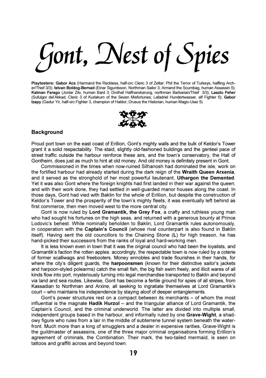 Tohle číslo Echoes konečně začíná představovat materiály k sanboxovému hernímu světu Erillion. Dostaneme jeho stručný popis, ale především popis města Gont a jeho podzemí. Město je popsané zajímavou formou: mapa, konkrétní očíslované domečky a jiné lokace (celkem 22), do nich jsou umístěné nehráčské postavy (včetně statistik a pokladů), ale především hustá změť vzájemných vazeb a dějových háčků. Přijdete do lokace A a dozvíte se, že se děje něco divného v lokaci B anebo že majitel má plán na vykradení lokace C. Podobným způsobem vede spousta háčků do vnějšího světa Erillion – do jiných měst na mapě, hexů, dobrodružství.