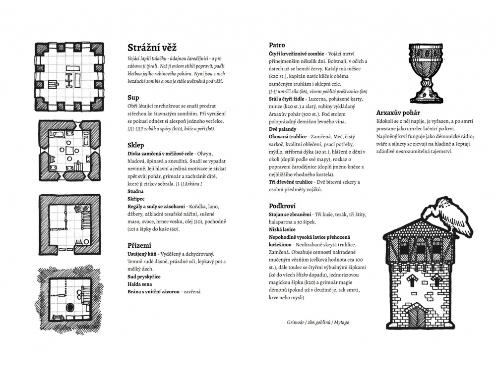 Strážní věž je rodnou sestrou Skřetí jeskyně, za svým sourozencem ale ve všem zaostává. Jestli jsem Jeskyni nazval jednohubkou, Věž je nanejvýš hrstka preclíčků. Je v ní méně interaktivity, její zápletka je mnohem jednodušší a přímočařejší. Pořád je to barvité dobrodružné místo na zpestření cestování nebo dokreslení dějové linky, pořád nabízí háčky, které lze zaseknout do přediva kampaně, a pořád obsahuje několik dobře hratelných situací, ale víc než výplň půlsezení nabídnout nemůže. A k tomu ten minimalismus hraničící s bezsystémovostí, která v mých očích ubírá každému takovému dobrodružství (protože nutně přenáší část práce, kterou by měl odvést autor, na DMa.)