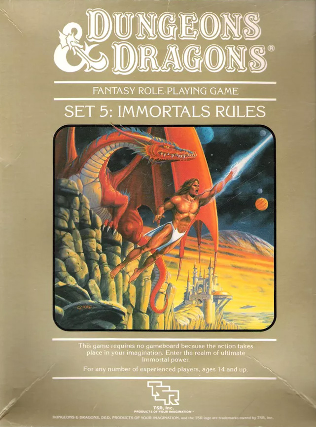 - 1986 - Dungeons & Dragons Set 5: Immortals Rules: tato krabice, pravidla pro postavy, které překonaly úrovně.