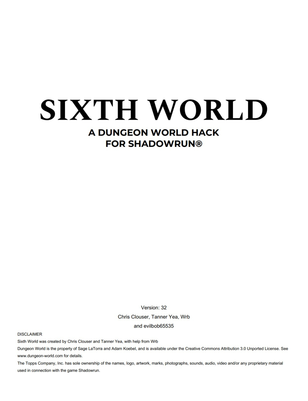 Sixth World s podtitulem A Dungeon World Hack For Shadowrun je fanouškovská, volně šířená adaptace herní rodiny Shadowrun do příběhově orientovaných pravidel převzatých ze hry Dungeon World (2012), respektive enginu Powered by the Apocalypse. V cyberpunkovém prostředí „Šestého světa“ v blízké budoucnosti Země, na kterou se vrátila magie i s fantasy rasami, všemu vládnou mocné korporace a realitou se prolíná virtuální síť Matrix, se hráči stanou „shadowrunnery“ – obyvateli ulic, kteří vykonávají nelegální práce a především se snaží přežít.