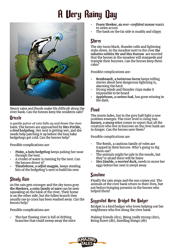 A Very Rainy Day je krátké dobrodružství pro Amazing Tales (2017) z prostředí Hlubokého temného lesa pro děti, které rády hrají se zvířaty nebo vílami. Obsahuje několik zápletek a navrhovanou postavu.
