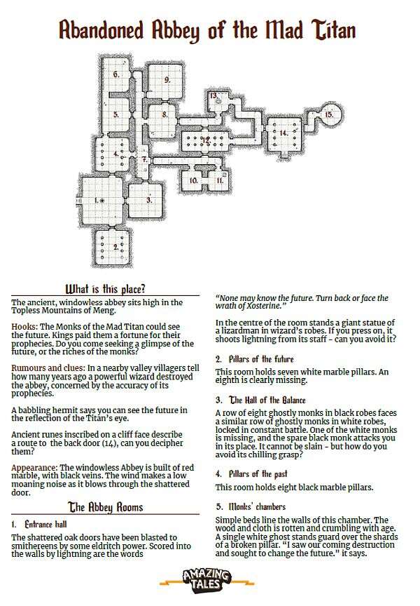 The Abandoned Abbey of the Mad Titan je krátké dobrodružství pro hru Amazing Tales (2017) z prostředí Kouzelných království pro děti, které chtějí rozlousknout tajemství horského opatství. Obsahuje mapu s 15 místnostmi a generátor proroctví.
