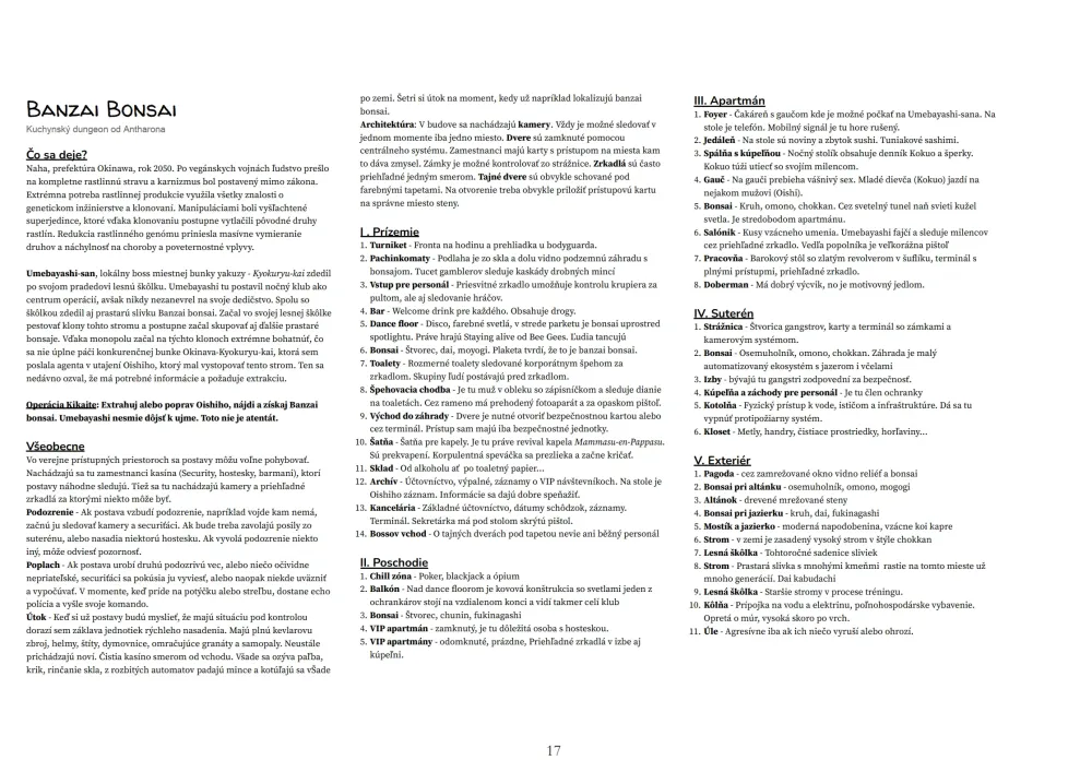 Banzai bonsai je dvoustránkové bezsystémové dobrodružství vytvořené v rámci designérského jamu Dungeonová kuchyně 2023 pořádaného RPG Fórem. Jde o kyberpunkový heist – dokážou se runneři dostat do vily šéfa jakuzy a ukrást tu správnou bonsai? Scénář na podrobné mapce představuje japonskou vilu s desítkami jen minimálně popsaných místností, ve kterých se pohybují strážní a důležité nehráčské postavy, jsou v nich rozmístěné kamery, připravený bezpečnostní systém a spousta bonsaií, z nichž jen jedna je ta pravá.