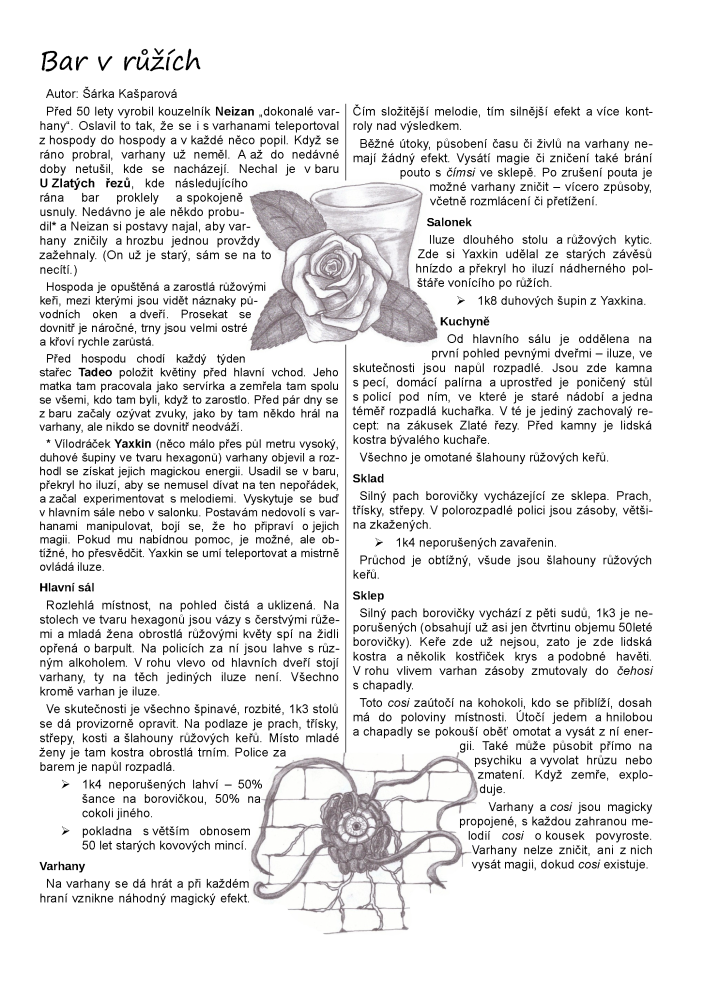 Bar v růžích je stručné, dvoustránkové dobrodružství bez určení pro konkrétní hru, které vzniklo v rámci tvůrčí výzvy RPG Fóra Dungeonová kuchyně 22. Popisuje malý zapomenutý a prokletý bar obývaný ďábelskými varhany, ve kterém máloco je tak, jak se zdá.