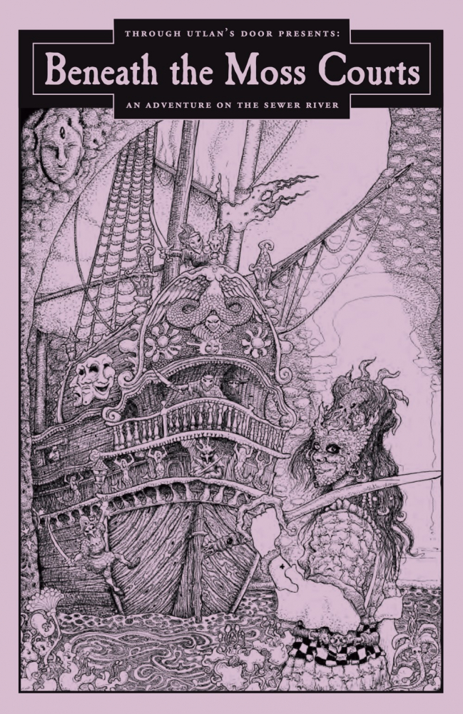 Beneath the Moss Courts je dobrodružství pro postavy na 2. až 4. úrovni ve hře Labyrinth Lord (2007) nebo jiných retroklonech D&D. Je zasazené do světa Zyan představovaného v zinu Through Ultan's Door a zamýšlené jako doprovodné dobrodružství k jeho třetímu číslu (2021). Vychází z pointcrawlu, který je v něm popsaný, a rozpracovává jednu z lokací do podoby plnohodnotného dobrodružství s pirátskou tématikou. Začíná tím, že dobrodruzi se dostanou to právních potíží (přiložen je popis soudního systému města Zyan). To vede ke snaze vloupat se pod sídlo nepřátelského inkvizitora. Dobrodružství je pojaté jako městský minidungeon s dalším vnořeným dungeonem (vrakem lodi).