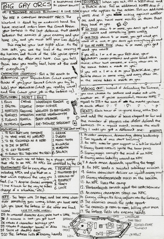 Big Gay Orcs je jednostránková, minimalistická hříčka, ve které se hráči stanou nejmocnějšími z kmene orků. Náčelník byl právě zavražděn a přišly nové příkazy od Velkého chána: na pevnost, ve které hráči sídlí, se žene nepřítel, a jejich úkolem je prodat svoje životy co nejdráž. Začíná poslední bitva, orkové zřejmě umřou a mají poslední příležitost vyjevit přátelům své skutečné city.