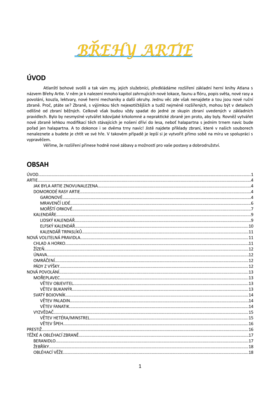 Břehy Artie je 57stránková rozšiřující příručka pro českou hru Atlana (2022). Její svět obohacuje o nový kontinent Artii, obývanou zmutovanými lidmi garony, hmyzoidním mravenčím lidem a mořskými orky. Příručka popisuje artijskou faunu, flóru, místopis i náboženství. Kromě toho obohacuje původní hru o volitelná pravidla pro různé fyzické stavy (nemoc, vyčerpání, pád z výšky…), nová povolání (mořeplavec, svatý bojovník a vyzvědač), těžké a obléhací zbraně, lodě a lodní souboje a řadu nových výhod, kouzel a preparátů. Úplnou novinkou jsou mocné „GAR předměty“ a biomanti, nehráčští kouzelníci čerpající svou sílu z pohlcování démonů.