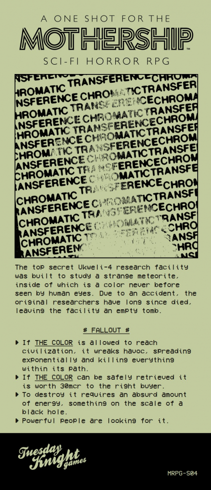 Chromatic Transference je čtvrtý oficiální brožurový scénář pro sci-fi hru Mothership, vhodný k jednorázovému hraní. Hráčské postavy v něm prozkoumávají opuštěné výzkumné středisko, jehož účelem bylo zkoumat záhadný meteoritu skrývající barvu, kterou lidské oko do té doby nevidělo. Původní posádka kvůli nehodě zemřela a je na postavách zjistit, co se stalo. Scénář je pojatý jako lineární sekvence šesti drobných lokací.