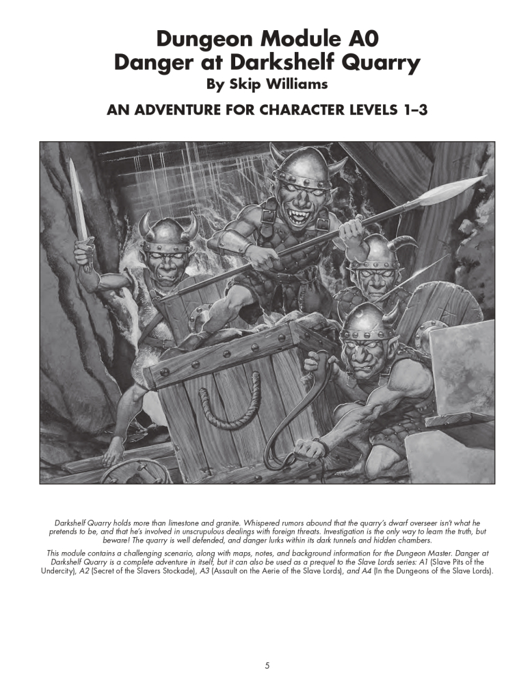 A0: Danger at Darkshelf Quarry je 24stránkové dobrodružství určené postavám na 1. až 3. úrovni v Advanced Dungeons & Dragons (1978), nový úvodní díl série A – Aerie of the Slave Lords. Dobrodružství vyšlo až více než dvacet let po vydání původních čtyř dílů série, v rámci sborníku A0–4: Against the Slave Lords (2013). Postavy jsou pověřeny vyšetřováním podezřelých úmrtí a zvuků linoucích se z místního kamenolomu. Prozkoumají při tom strážní domek (tří podlaží o 32 očíslovaných lokacích) i lom samotný (3 podlaží o 34 očíslovaných lokacích) a objeví doupě otrokářů. Stejně jako u zbytku série se jedná o dungeon crawl, dobrodružství ale nevzniklo jako turnajové a nabízí tak i více sociálních situací.