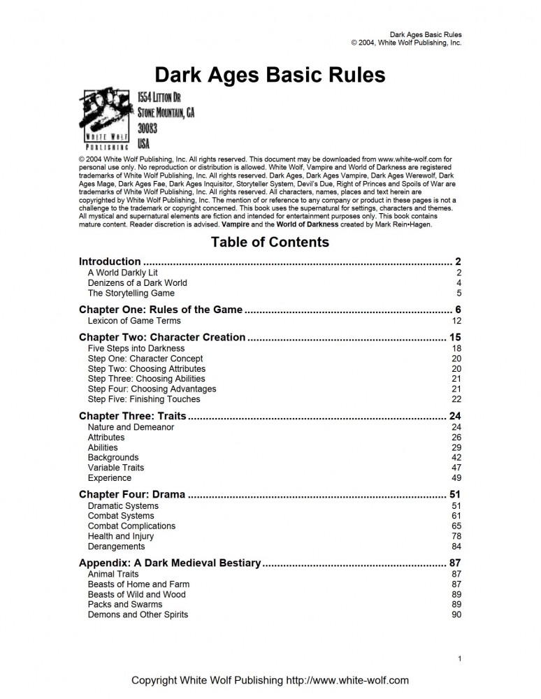 Dark Ages Basic Rules je zdarma dostupný, zhruba 90stránkový dokument sloužící jako základní příručka hry Dark Ages (2002). Jedná se o výtah z příručky Dark Ages: Vampire (2002) – obsahuje všechna uvedená pravidla potřebná ke hře, ale bez informací o upírech. Příručka tak pouze nastiňuje celkové ladění světa, dál už se jedná o čistý mechanický popis pravidel, postavených na systému Storyteller.