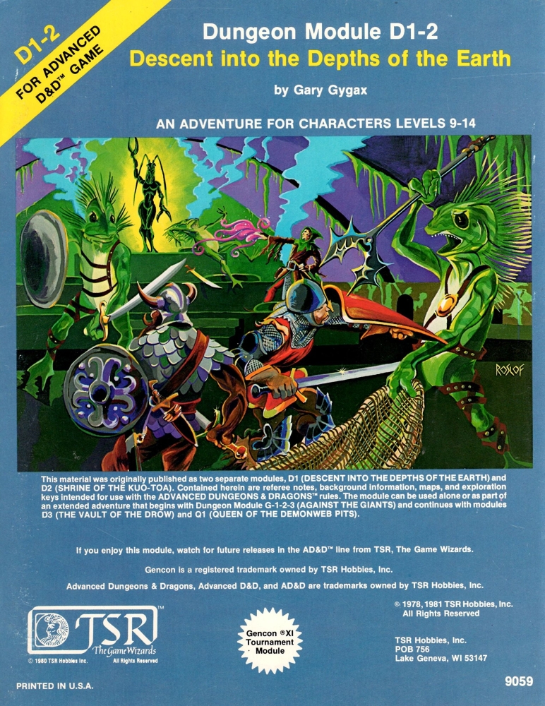 D1–D2: Descent Into the Depths of the Earth je kompilace dvou starších dobrodružství pro první edici Advanced Dungeons & Dragons (1978), stejnojmenného D1: Descent Into the Depths of the Earth (1978) a D2: Shrine of the Kuo-Toa (1978). Navazuje na poslední díl předchozí trilogie o obrech, G3: Hall of the Fire Giant King (1978). Dobrodruzi na 9. až 10. úrovni cestují podzemní krajinou jeskyní a průchodů, bojují s drowy a mozkožrouty, až nakonec dorazí do velkého jeskynního komplexu o necelých 50 popsaných lokacích, obývaný nemrtvými, fialovými červy, houbami, trolly, troglodyty a jiným podsvětním životem. Druhá část kulminuje v dungeonu o zhruba 35 popsaných lokacích – chrámu rasy rybovitých humanoidů s ústředním zikkuratem.