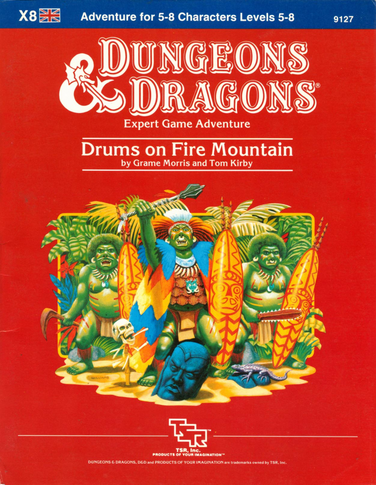 X8: Drums on Fire Mountain je 32stránkové dobrodružství určené postavám na 5. až 8. úrovni v Basic Dungeons & Dragons (1981), osmé ze série X – Expert. Postavy jsou v něm vyslány na ostrov, ze kterého na pirátské výpravy vyrážejí orkové sloužící neznámému kančímu bohovi. Dobrodružství se skládá z 5stránkového hexcrawlu (17 popsaných lokací a tři tabulky náhodných setkání) a pěti vzájemně propojených dungeonů pod ostrovem (celkem 46 popsaných místností). Kromě toho modul obsahuje popis dvou hlavních antagonistů a popis pěti nových nestvůr, inspirovaných kulturou a mýty polynéských národů. Svůj název modul získal podle bubnů, jejichž všudepřítomný zvuk hráčům odměřuje první část dobrodružství.
