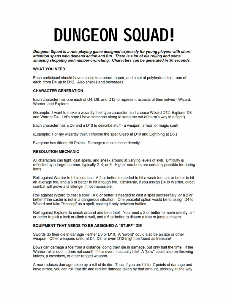 Původní pravidla minimalistické hry Dungeon Squad! (2005) mají podobu PDF dokumentu o pouhých pěti stránkách.